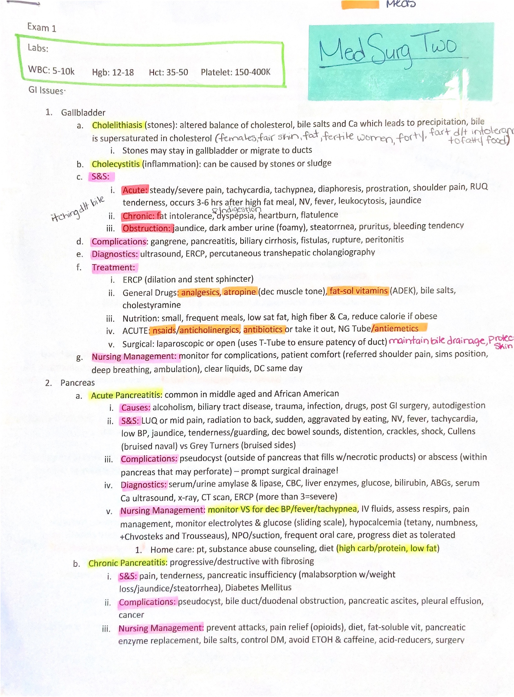 Well, 2020 has been a bit difficult for just about everyone. Probably a bit more difficult than this course is. So, that means we could all use a little help. I have attached my study guides from my Med Surg 2 class. There’s a Doc available for each exam for download. I recommended adding whatever one feels is necessary from their own lecture. I’ve also attached PDF photos of my own additions to my study guide I added during my actually studying for the exam when I was answering questions on the additional question study guide that is attached. As I’ve mentioned before in other posts, everyone studies and learns differently and that is likely to change from course to course. Being able to adapt ones studying techniques to the course is going to aid in excelling and understanding in the course.