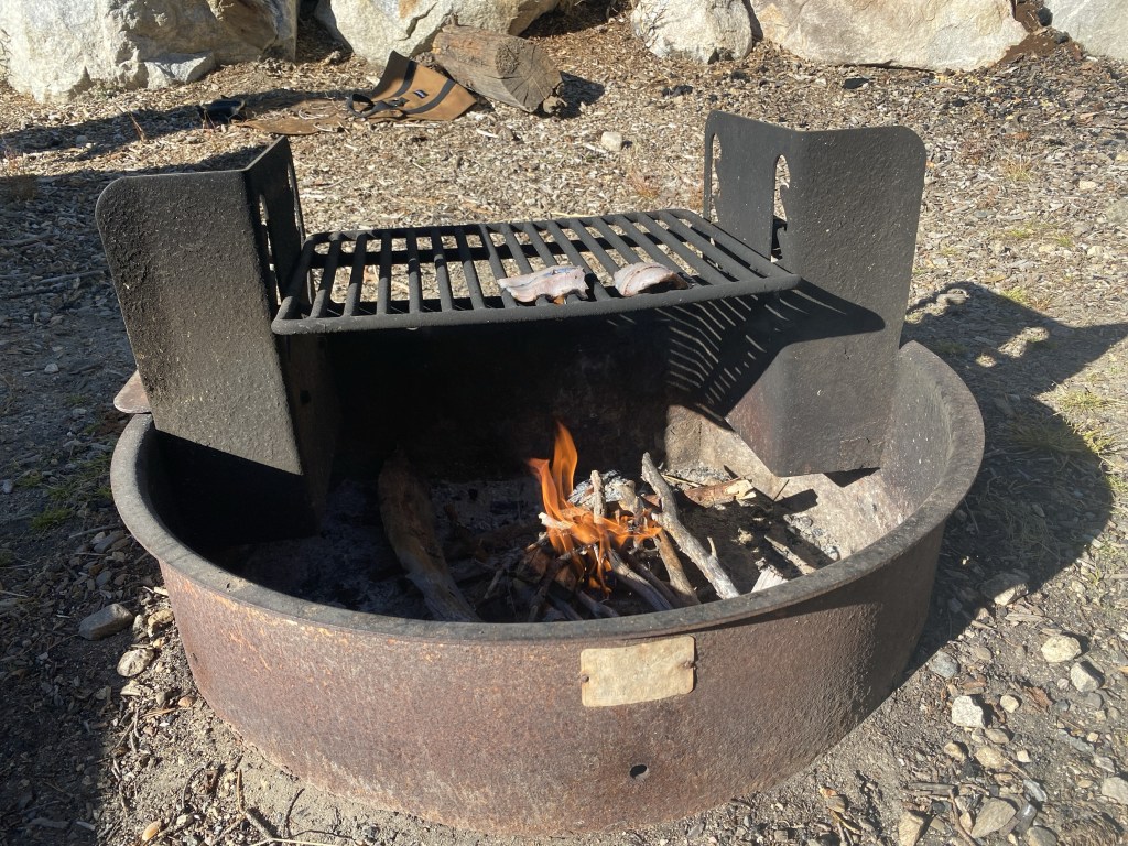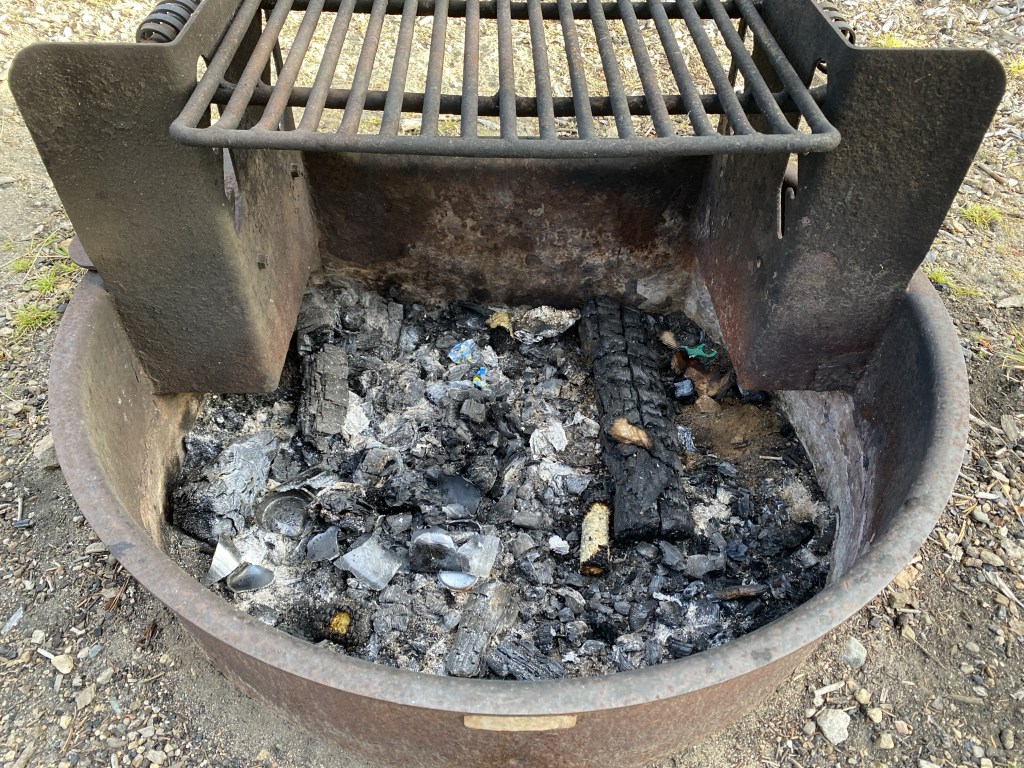 Another important lesson was fire safety. We discovered that a previous camper had left trash in our fire pit, including glass and foil. With gloves and a shovel, we cleaned it out, using a log cabin technique to create a roaring fire.